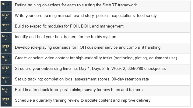 The most common mistake operators make when building a training program is starting with content before defining the goal. They write menu descriptions, build a binder, and hand it to a new hire — without ever establishing what success looks like at the end of training.